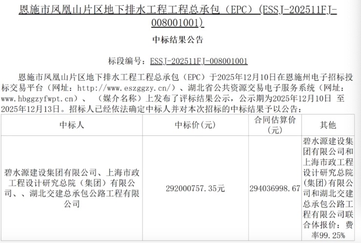 近日,中国水网从E20环境平台标讯采集系统E标通获悉,湖北省恩施市凤凰山片区地下排水工程工程总承包(EPC)中标结果公告发布。碧水源建设集团有限公司、上海市政工程设计研究总院(集团)有限公司、湖北交建总承包公路工程有限公司中标,中标价为292000757.35元。