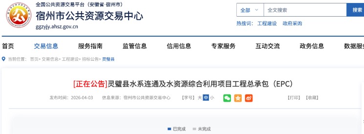 4月7日,中国水网从E20环境平台标讯采集系统E标通获悉,安徽省宿州市灵璧县水系连通及水资源综合利用项目工程总承包(EPC)发布招标公告,项目总投资为75135万元。